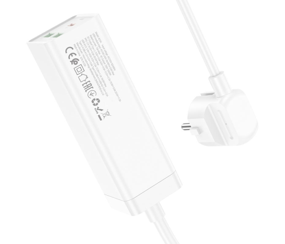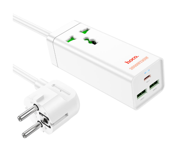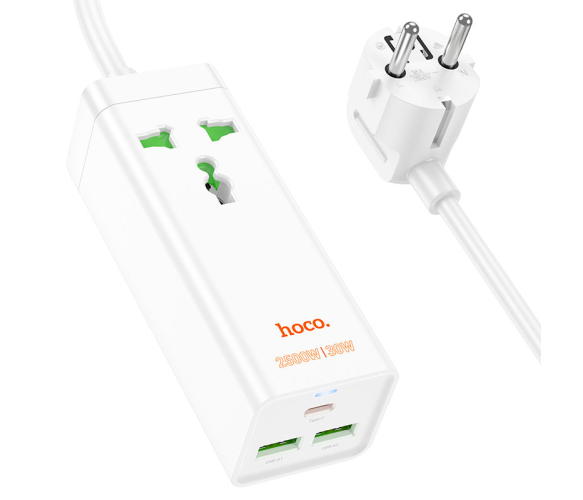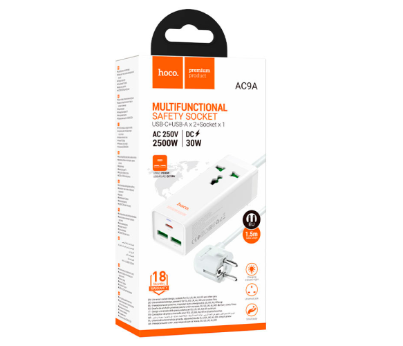 Мережевий фільтр HOCO AC9A на 1 розетку + 2 USB+USB-C, 30W, 220В, кабель 1,5м, White, Box