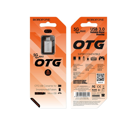 Перехідник Borofone BV2 USB2.0(F) => Micro(M), Silver, Blister