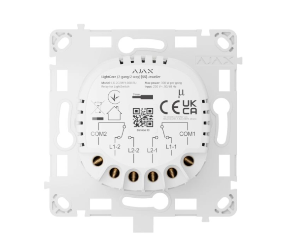 LightSwitch встановлюється без заміни електропроводки на об'єкті. Реле Ajax LightCore не потребує під'єднання кабелю нейтралі та працює тільки від фази живлення. Вимикач виконаний у стандартному європейському формфакторі. Елементи з'єднуються між собою механічно, без використання інструментів. У лінійці пристроїв Ajax є два формати вимикачів LightSwitch: одинарні та комбіновані. LightSwitch може керувати освітлювальними приладами потужністю від 5 до 600 Вт. Для ламп меншої потужності в комплекті є конденсатор, що приєднується паралельно освітлювальному приладу.