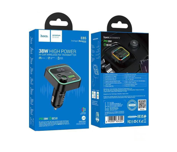 FM-модулятор Hoco E85 — це пристрій, який дозволяє передавати аудіо зі свого смартфона або іншого джерела на автомобільну аудіосистему через FM-діапазон. Він також оснащений функцією швидкого заряджання для ваших пристроїв.