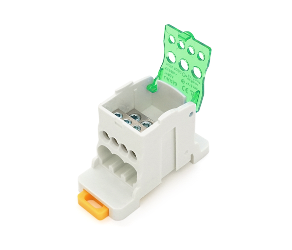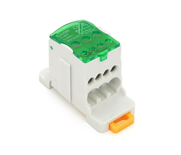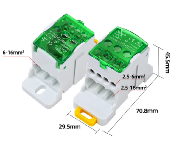 Паралельний розгалужувач-спліттер проводів UKK80, 6 виходів(латунь)2-2,5*16мм2 *4-2,5-6мм2 *1-6-16мм2, AC690V, 80А, 70,8*45,5мм, GREEN