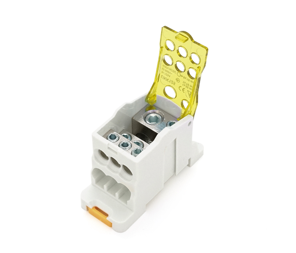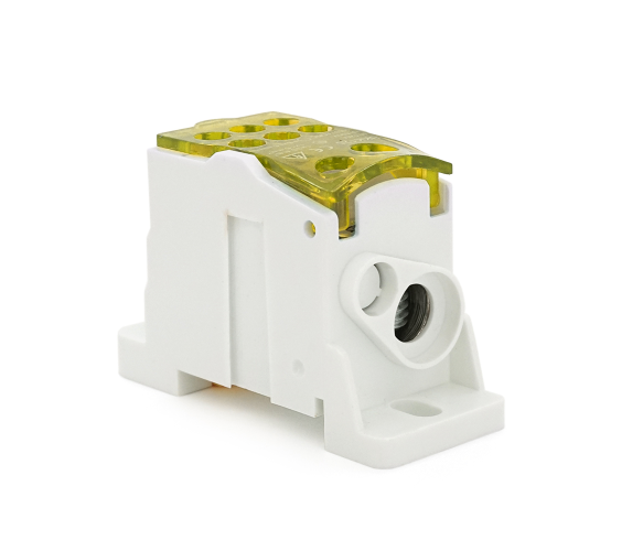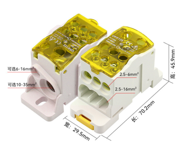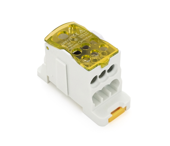 Паралельний розгалужувач-спліттер проводів UKK125, 6 виходів(латунь)6-2,5*16мм2*1-10-35мм2*1-6-16мм2, AC690V, 125А, 70,8*45,9*29.5мм, YELLOW