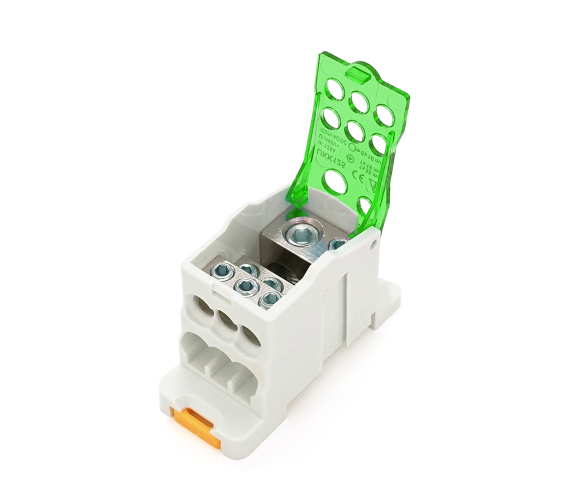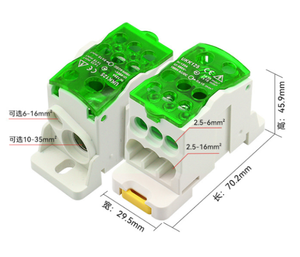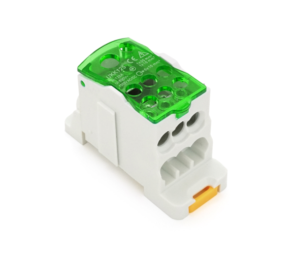 Паралельний розгалужувач-спліттер проводів UKK125, 6 виходів(латунь)6-2,5*16мм2*1-10-35мм2*1-6-16мм2, AC690V, 125А, 70,8*45,9*29.5мм, GREEN