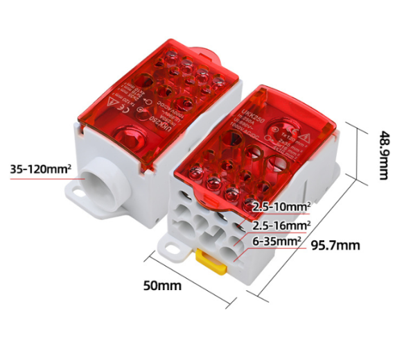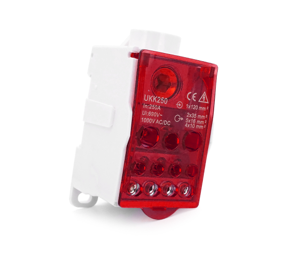 Паралельний розгалужувач-спліттер проводів UKK250, 11 виходів (латунь) 2х35мм+5х16мм+4х10мм, вхід 1х120мм, AC/DC 1000V, 250А, 95*50*50мм, RED