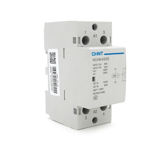 Електромеханічний контактор модульного виконання для дистанційного керування потужним навантаженням. Пристрій призначений для частих комутацій силових ланцюгів змінного струму та встановлюється на стандартну DIN-рейку у розподільчий щит. Контактор управляється низькою напругою AC24V, що забезпечує безпеку оператора, при цьому дозволяє комутувати значні потужності до 12 кВт.