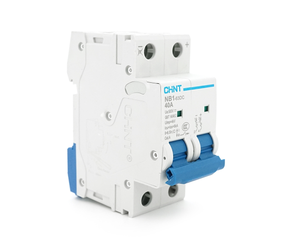 Двополюсний автоматичний вимикач серії NB1-63DC призначений для захисту кіл постійного струму від перевантажень та коротких замикань. Пристрій розрахований на номінальний струм 40 А та напруга до 500 В постійного струму. Монтаж на стандартну DIN-рейку забезпечує зручне встановлення у розподільні щити та шафи.