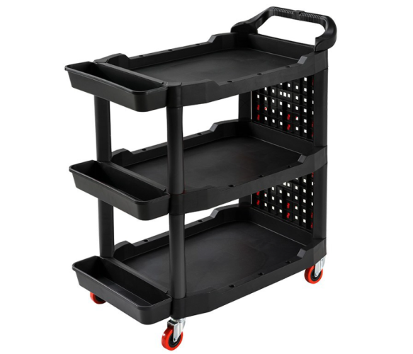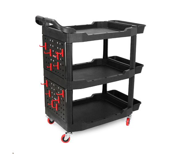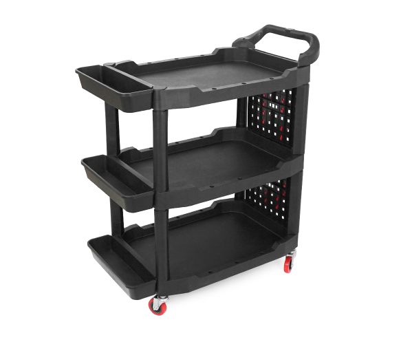 Легкий пластиковий трирівневий візок для зберігання та транспортування інструментів та автохімії. Її полиці дозволяють ергономічно розмістити всі речі так, як це потрібно майстру під час роботи.