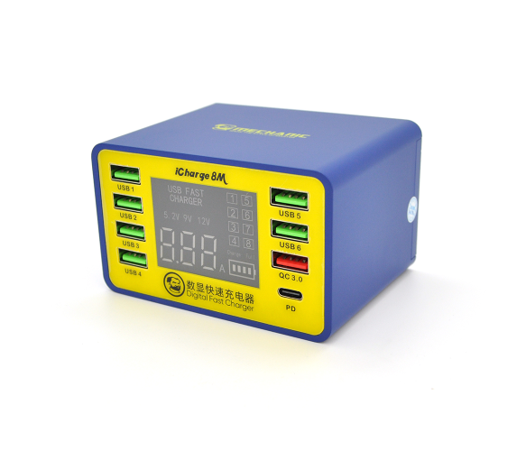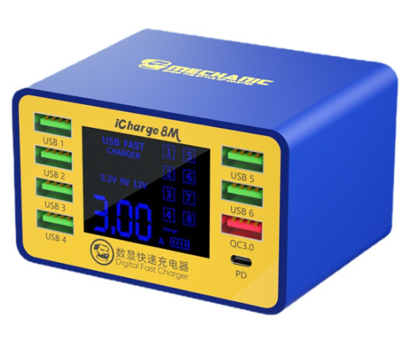 MECHANIC iCharge 8M є сучасною зарядною станцією з розширеними можливостями для одночасного живлення декількох пристроїв. Пристрій оснащений шістьма інтелектуальними USB-портами з підтримкою технології Quick Charge 3.0 та Power Delivery 3.1, що забезпечує швидку та безпечну зарядку різних гаджетів. Вбудований цифровий дисплей дозволяє контролювати процес заряджання в реальному часі.