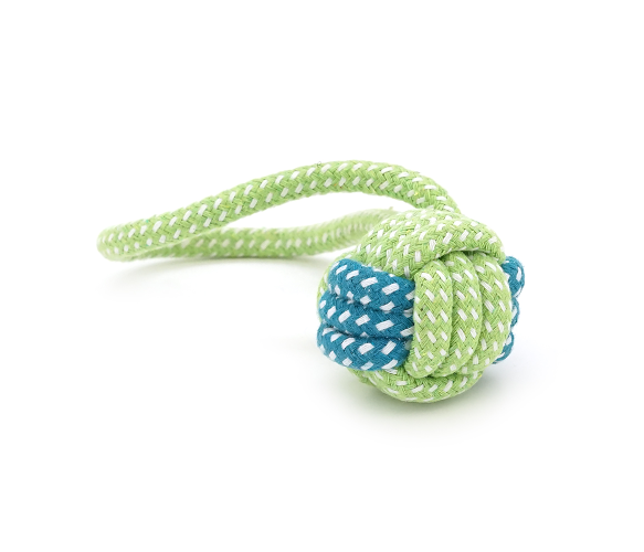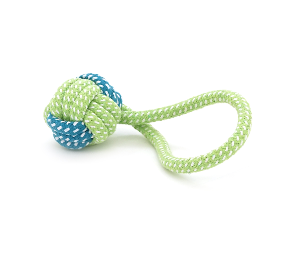Іграшка для собак мотузка-апорт - це функціональний виріб для активних ігор та гігієни ротової порожнини вихованця. Іграшка виконана у формі кулі діаметром 6 см із зручною петлею довжиною 14 см, виготовлена з переплетених бавовняних волокон із міцними вузлами. Контрастне зелено-синє забарвлення забезпечує хорошу видимість на різних поверхнях під час гри.
