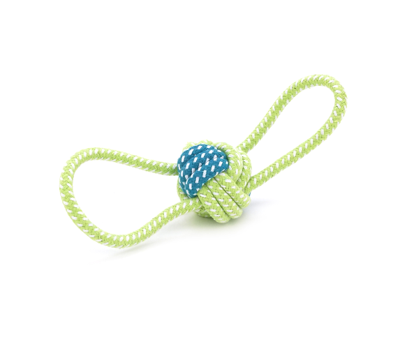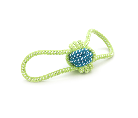 Іграшка для собак мотузка-апорт - це функціональний виріб для активних ігор та тренувань домашніх тварин. Іграшка виконана у формі кулі діаметром 6 см із двома міцними петлями-ручками загальною довжиною 16 см, виготовлена з переплетених бавовняних волокон із вузловими з'єднаннями. Контрастне зелено-синє забарвлення забезпечує хорошу видимість іграшки на різних поверхнях під час гри.