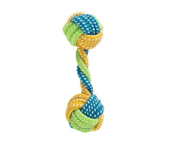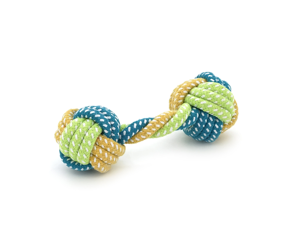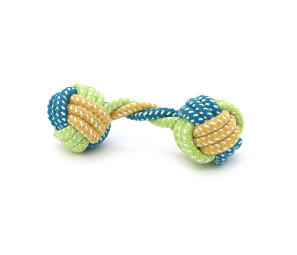 Іграшка для собак мотузка-апорт із вузлами - це функціональне ігрове рішення для активних вихованців, виконане у формі гантелі. Виріб виготовлений із міцних бавовняних ниток із посиленими вузлами, що забезпечують довговічність при інтенсивній експлуатації. Розмір 6×18 см оптимальний для собак дрібних та середніх порід, а контрастне зелено-синє забарвлення забезпечує хорошу видимість під час ігор на природі.