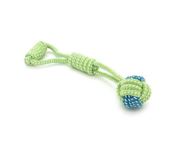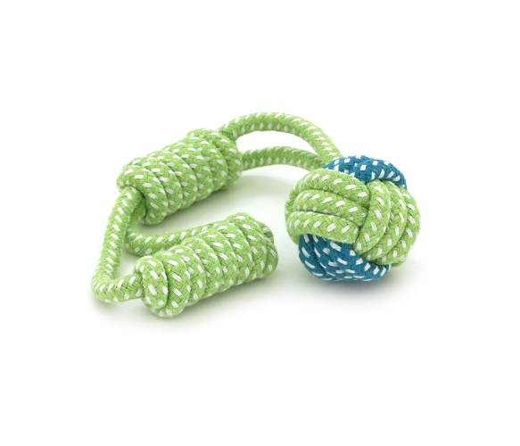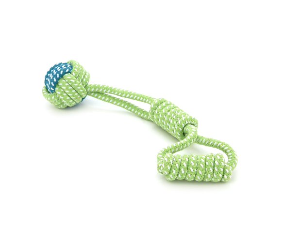 Іграшка для собак мотузка-апорт з вузлами - це багатофункціональне рішення для активних ігор та гігієни ротової порожнини вашого вихованця. Іграшка форми кулі діаметром 6 см із зручною ручкою-петлею довжиною 27 см виготовлена з переплетених бавовняних волокон із надійними вузлами. Контрастне зелено-синє забарвлення забезпечує хорошу видимість на різних поверхнях під час гри.