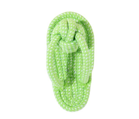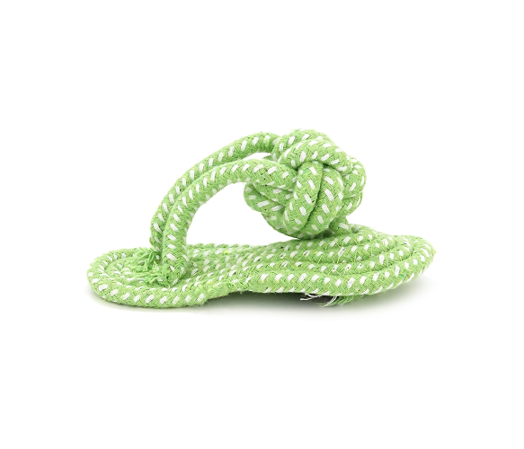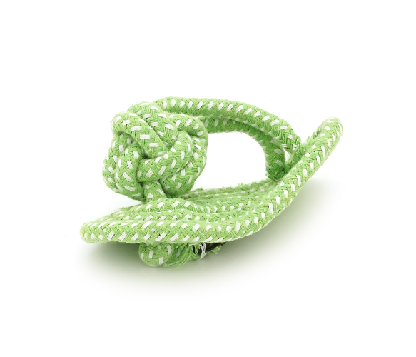 Іграшка для собак мотузка-апорт з вузлами - це функціональний виріб для активних ігор та гігієни ротової порожнини вашого вихованця. Іграшка виконана у формі тапочка розміром 7×15.5 см із міцної бавовняної мотузки з надійними вузлами, пофарбованої в контрастний зелено-синій колір. Спеціальна плетена структура забезпечує масаж ясен та механічне очищення зубів собаки під час гри.