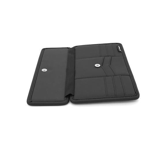 Автомобільний органайзер CABULE на сонцезахисний козирок - компактне і функціональне рішення для організації простору в салоні автомобіля. Виріб розміром 27×15 см виготовлено з якісної PV-шкіри чорного кольору, що забезпечує довговічність та простий догляд. Органайзер кріпиться на сонцезахисний козирок за допомогою надійних ременів і пропонує шість відділень різного розміру для зберігання необхідних дрібниць, а також вбудовану кишеню для паркувального номера телефону.