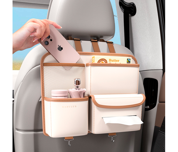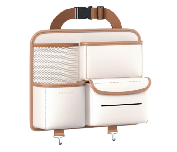 Автоорганайзер CABULE на передні сидіння це практичне рішення для організації простору в салоні автомобіля. Органайзер розміром 35×28×7.5 см виготовлений із якісного матеріалу PV-шкіра бежевого кольору, що забезпечує довговічність та гармонійне поєднання з інтер'єрами більшості автомобілів. Конструкція із чотирма функціональними відділеннями кріпиться на підголівники передніх сидінь, забезпечуючи зручний доступ до особистих речей під час поїздки.