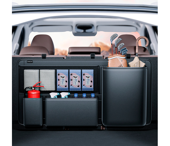 Автомобільний органайзер CABULE для багажника – це практичне організаційне рішення для оптимізації простору у зоні вантажного відсіку. Виріб розміром 91×45 см виготовлено з якісної штучної шкіри, стійкої до стирання та вологи. Органайзер кріпиться до спинок задніх сидінь за допомогою регульованих ременів і пропонує чотири функціональні відділення для систематизації предметів, що перевозяться.