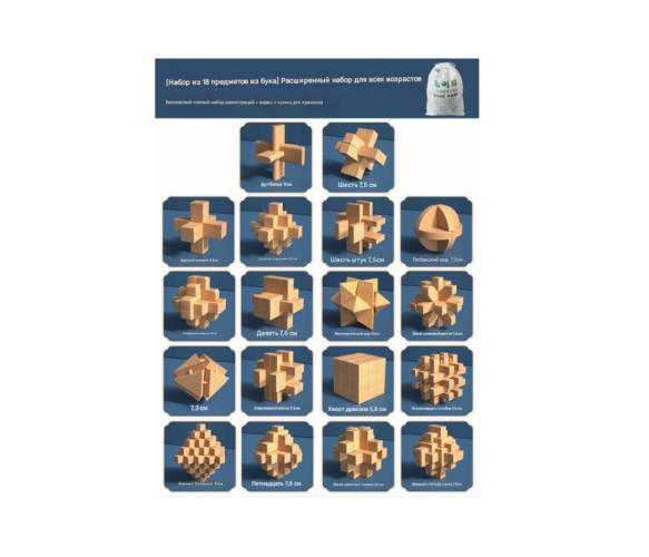 Набір 3D-головоломок "18 предметів" - це комплексна колекція просторових головоломок для розвитку логічного та аналітичного мислення. Набір включає 18 головоломок різних типів: від класичних міжмережевих конструкцій до унікальних авторських моделей. Всі елементи виготовлені з натурального дерева та упаковані в практичну бавовняну сумку для зберігання, що забезпечує безпеку та мобільність комплекту.
