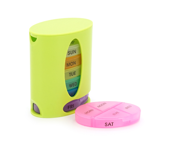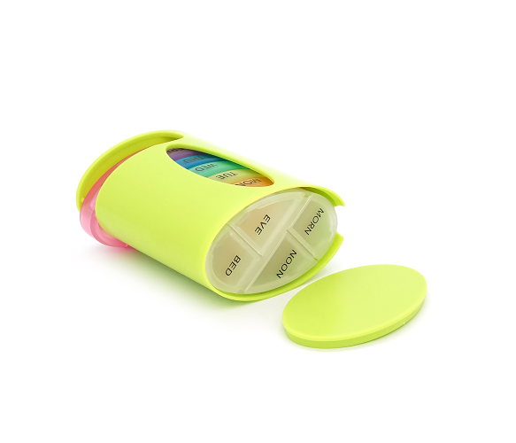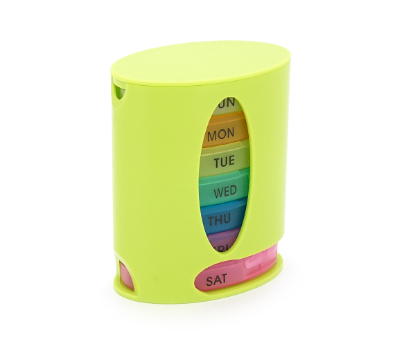 Таблетниця на 7/28 знімних осередків - це багатофункціональний органайзер для систематизації прийому лікарських препаратів по днях тижня та доби. Конструкція складається із семи овальних знімних контейнерів різних кольорів, кожен з яких розділений на чотири незалежні відділення з маркуванням ранок/день/вечір/ніч. Виріб виготовлений із харчового пластику та має компактні розміри 9.6×6×12 см, що забезпечує зручне зберігання та транспортування тижневого запасу ліків.