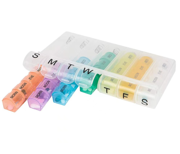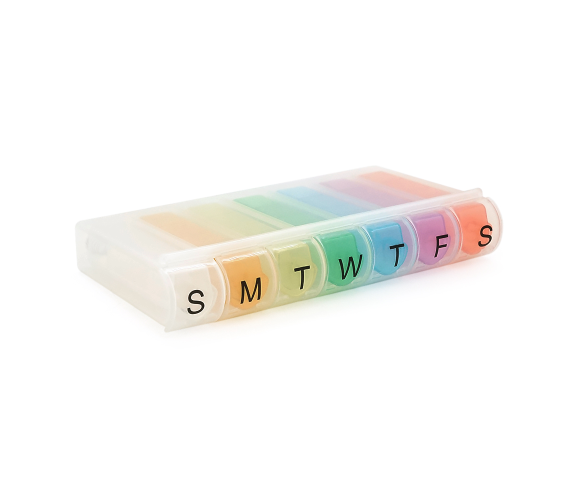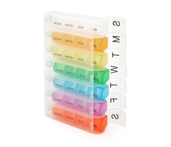 Таблетниця на 7/28 знімних осередків - це багатофункціональний органайзер для комплексної організації прийому лікарських препаратів та вітамінів. Конструкція складається з семи знімних блоків різних кольорів з маркуванням днів тижня, кожен із яких розділений на чотири відділення із зазначенням часу доби (ранок, день, вечір, ніч). Виріб виготовлений із харчового пластику PP та має загальні розміри 19.7×11×3.8 см, що забезпечує зручне зберігання тижневого запасу ліків.