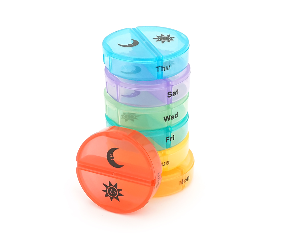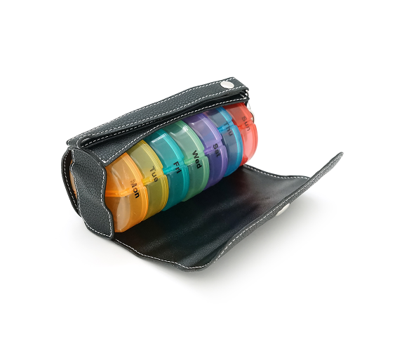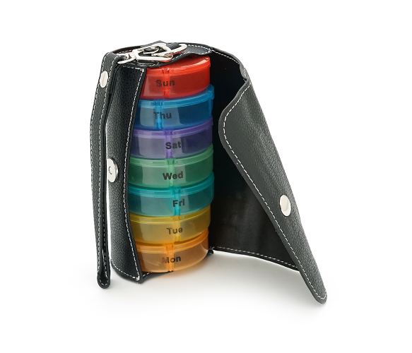 Таблетниця переносна на 7/14 знімних осередків (різних кольорів), круглі розділені день тижня/час доби, пластик/PV-шкіра, 19.3*7.4*3.6см