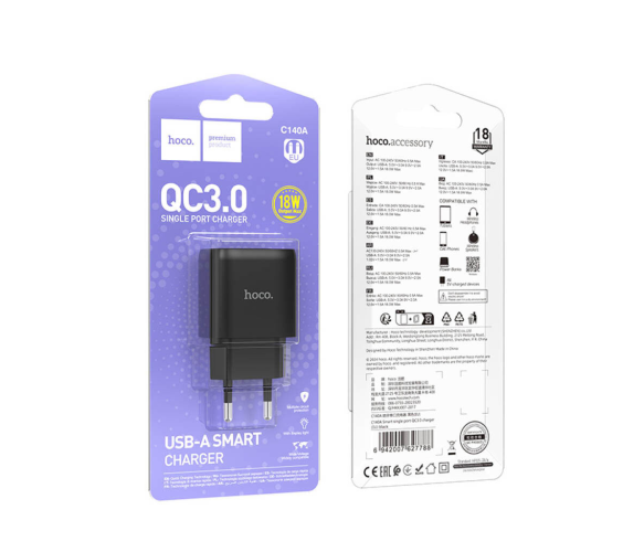 СЗУ 110-240V HOCO C140A 1xUSB, 18W, Black, Blister