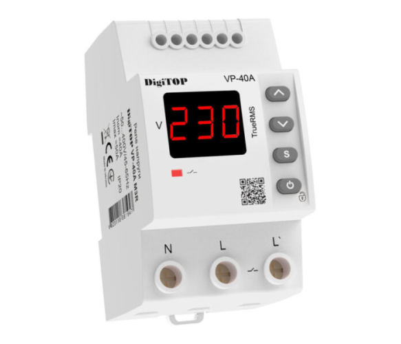 Захисне реле напруги однофазне VP-40AM3R на DIN-рейку, 40А, 8800Вт, 120-270В, тримодульне з індикатором напруги (червоний)