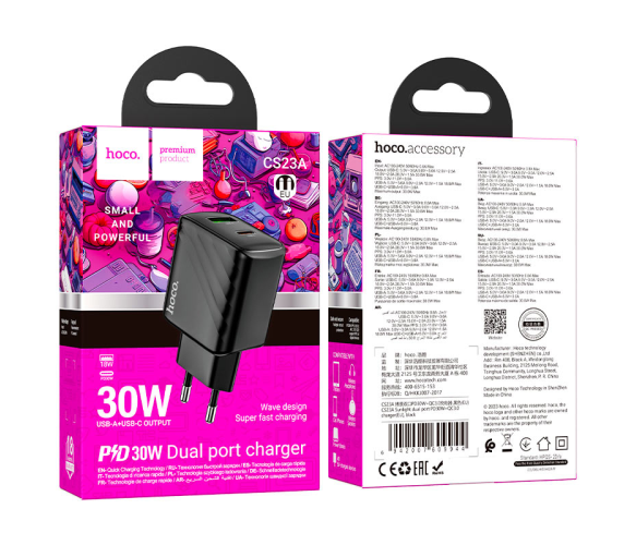 Компактний і потужний зарядний пристрій HOCO CS23A з двома портами (USB-C і USB) дозволяє швидко і безпечно заряджати ваші гаджети. Завдяки підтримці напруги 110-240V його можна використовувати у різних країнах, а потужність 30W забезпечує швидке заряджання смартфонів, планшетів та інших пристроїв.