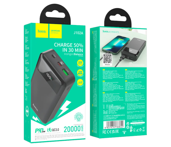 Power Bank HOCO J102A 20000mAh, USB+Type-C, 20W, Black, 0.45kg