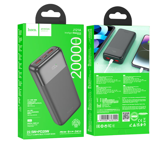 Power Bank HOCO J121A 20000mAh, 2USB+Type-C, 22.5W+PD20W, Black, 0.47kg