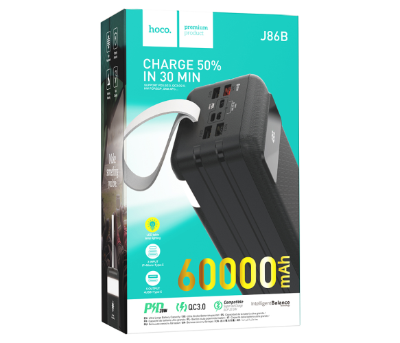 Power Bank HOCO J86B 60000mAh, 4USB+2Type-C+Lighting+micro, 22.5W+PD20W, ліхтарик, Black, 1.33kg
