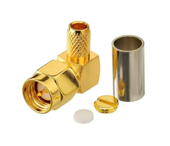 Роз'єм кутовий SMA Male для кабелю RG58 RG142 RG223 LMR195 SYV50-3 і аналогів із зовнішнім діаметром ізоляції до 4.95 мм. Центральний пін монтується на центральний провід кабелю методом пайки. Роз'єм затискається на кабелі обтискним інструментом (кримпером).