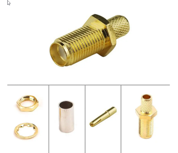 Роз'єм ВЧ SMA Female для кабелю RG58 RG142 RG223 LMR 195 SYV50-3 і аналогів із зовнішнім діаметром ізоляції до 4.95 мм. Центральний пін монтується на центральний провід кабелю методом пайки (можливий обтиск). Роз'єм затискається на кабелі обтискним інструментом (кримпером).