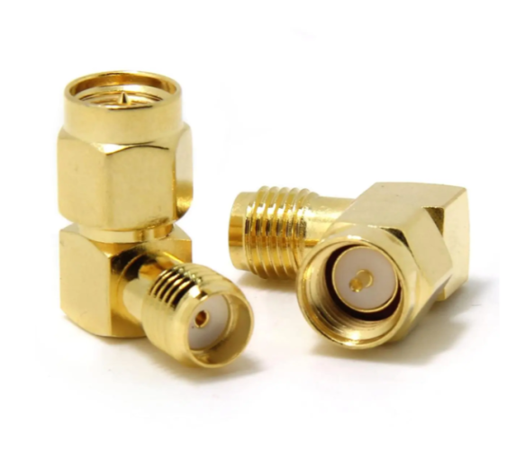 Кутовий 90° перехідник (Г-подібний) має роз'єм SMA Male (тато) з одного боку і SMA Female (мама) - з іншого.