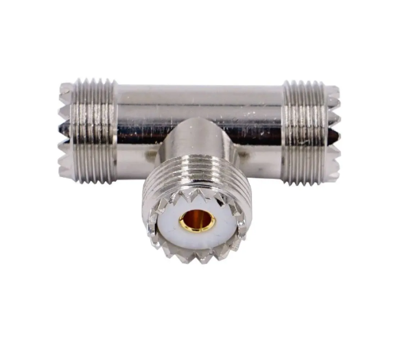 Перехідник має 3 роз'єми UHF Female (з зовнішньою різьбою і без штирька). За допомогою цього роз'єму можна, наприклад, організувати схему підключення двох антен до одного роз'єму і т. п.