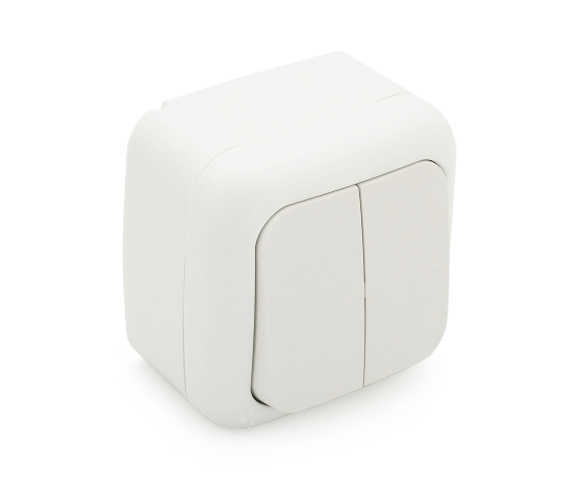 Вимикач двоклавішний зовнішній.Має пиловологозахист IP54.Номінальний струм: 10А.Напруга: 230В.Країна виробник: Туреччина.