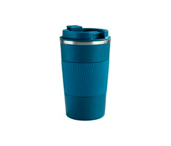 Термокухоль Merlion з нержавіючої сталі, об'єм 380 мл., синій, з силіконовим чохлом та відкидною кришкою