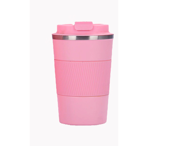 Термокухоль Merlion з нержавіючої сталі, об'єм 380 мл., рожевий, з силіконовим чохлом та відкидною кришкою