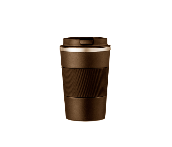 Термокухоль Merlion з нержавіючої сталі, об'єм 380 мл., коричневий, з силіконовим чохлом і відкидною кришкою
