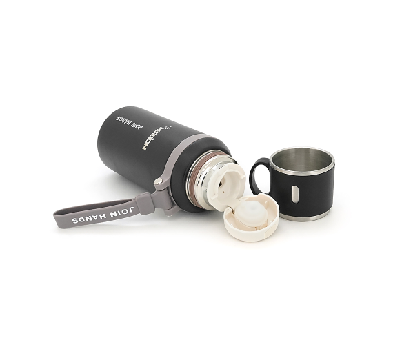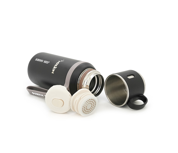 Термос для чаю Merlion з нержавіючої сталі, з ситечком, чашкою та ручкою для перенесення, об'єм 600 мл., чорний