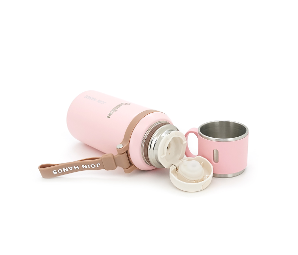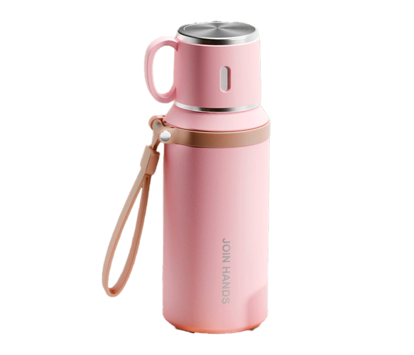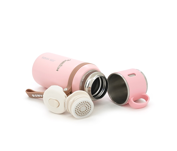 Термос для чаю Merlion з нержавіючої сталі, з ситечком, чашкою та ручкою для перенесення, об'єм 600 мл., рожевий