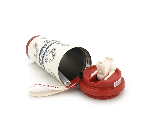 Термокухоль пластиковий Merlion Coffee, з трубочкою, об'єм 500мл., колба з нержавіючої сталі, білий з червоним і сірим