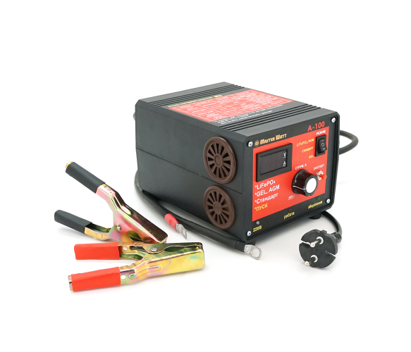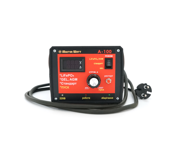 A-100 має захист від короткого замикання, від неправильного підключення полярності, від перегріву, від високої напруги в мережі. закипання» акумулятора.