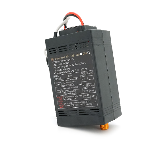 Імпульсний зарядний пристрій призначений для заряду та відновлення (десульфатації) автомобільних акумуляторів (АКБ) всіх видів, для заряду Літій-залізо-фосфатних (LiFePO4), AGM і гелевих акумуляторів, може використовуватися як передпусковий пристрій для швидкого заряду розрядженої АКБ і як блок живлення 12В 25А.