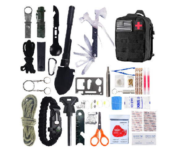 Туристична сумка з набором для виживання, 35 предметів, пиловлагонепроникна, на змійці, (ножиці, лопатка, топорик.ліхтарик, та ін,) 20*30*10см