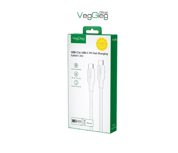 Кабель VEGGIEG V-M001C, Type-C(Male) to Type-C(Male) PD cable, 60 Вт, струм 3 А, 480 Мбіт/с, White, довжина 1,2 м, Box