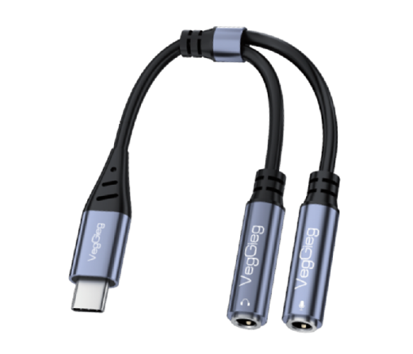 Перехідник VEGGIEG V-K204, 1/Type-C(Male) to=> 2/Jack 3.5mm(F)(навушники + мікрофон), Black/Silver, Box