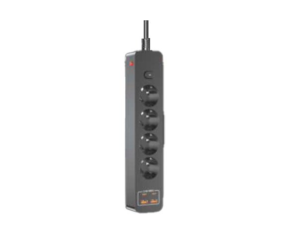Мережевий фільтр на 4 розетки + 2 USB виходи 5V-2.4A + 2PD, кнопка включення з індикатором, 10A, 240V/2500W, Black