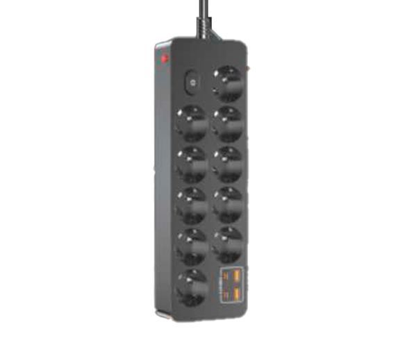 Мережевий фільтр на 10 розетки + 2 USB виходи 5V-2.4A + 2PD, кнопка включення з індикатором, 10A, 240V/2500W, Black