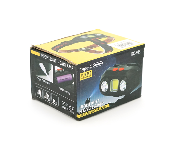 Налобний Ліхтарик KX-303, 3+3 реж., COB, корпус-пластик, водостійкий, 18650 акумулятор, USB кабель, BOX
