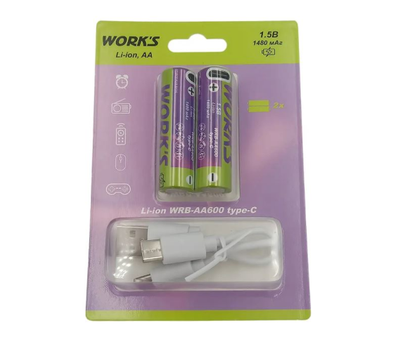 Акумуляторные батарейки Li-ion WRB AA600, тип АА, 1.5V, ype-c, 1480mAh, блістер 2шт